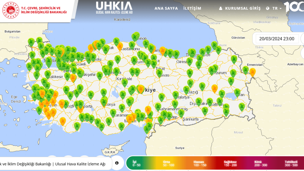 Bu tabloya göre hava kalitesi en düşük ve havası en kirli ülkeler (kırmızı aralıkta bulunanlar); Bangladeş, Pakistan, Hindistan, Tacikistan, Irak, Birleşik Arap Emirlikleri, Nepal, Mısır gibi ülkelerdir. Şehir bazında bakıldığında Uzak Doğu ülkelerindeki şehirlerin kırmızı alarm verdiği görülüyor. Ülkemizde ise genel itibariyle hava kalitesinin ortalama düzeyde (turuncu aralıkta) olduğu görülüyor. Aşağıdaki tablo Çevre ve Şehircilik Bakanlığının sitesinden alınmış 2024 verileridir. Bu verilere göre havamızın ortalama düzeyde olduğunu ifade edebiliriz. Tabi daha iyi olması gerekir diye eklememiz şart.